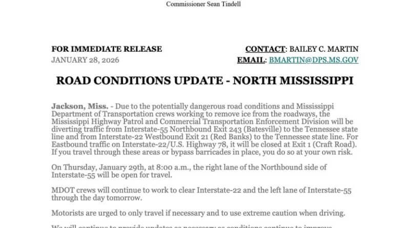 Mississippi Highway Patrol and the Commercial Transportation Enforcement Division diverted traffic on portions of Interstate 55 and Interstate 22 on Wednesday because of potentially dangerous road conditions and Mississippi Department of Transportation crews removing ice from the roadways, officials said in a Facebook post.