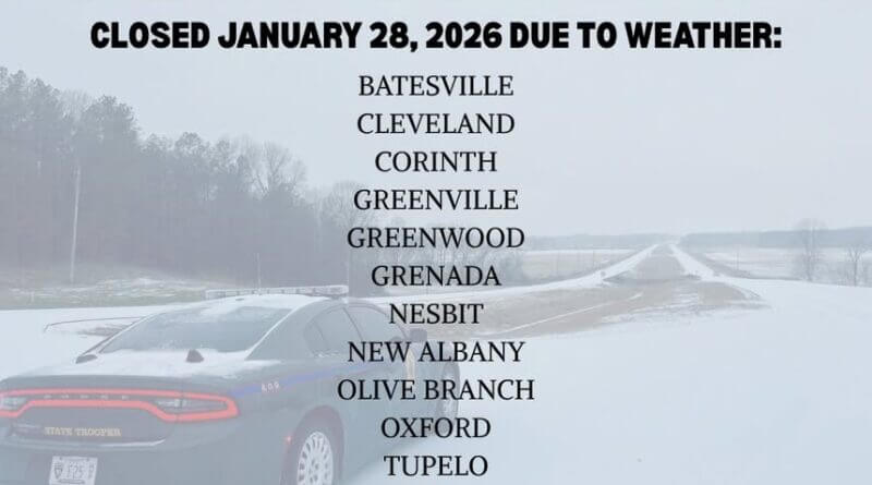 All Driver Service Bureau locations in North Mississippi will remain closed Jan. 28 because of winter weather and hazardous conditions, the bureau said on its Facebook page.