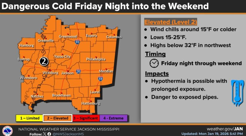 A Facebook post warned of an “Elevated” threat for dangerously cold conditions across the area Friday night into the weekend, urging residents to continue monitoring forecasts and outlooks.