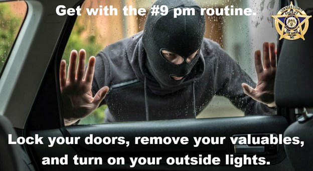 The post recommended locking vehicle doors, removing wallets, firearms, electronics and purses, and turning on exterior lights or security cameras where available. It also asked neighbors to report suspicious activity in their neighborhoods.