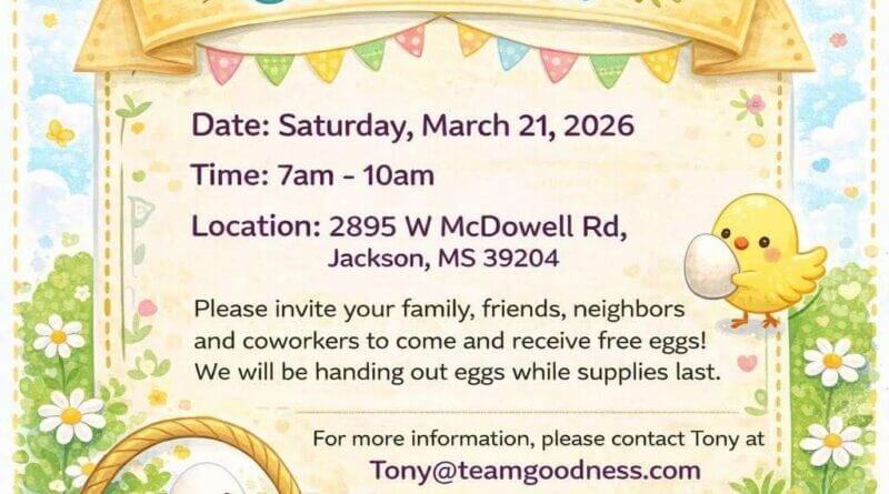 JACKSON — The Goodness Project will give away free eggs Saturday, March 21, from 7 a.m. to 10 a.m. at 2895 W. McDowell Road, organizers said. The distribution is open to the public and eggs will be handed out on a first-come, first-served basis while supplies last.