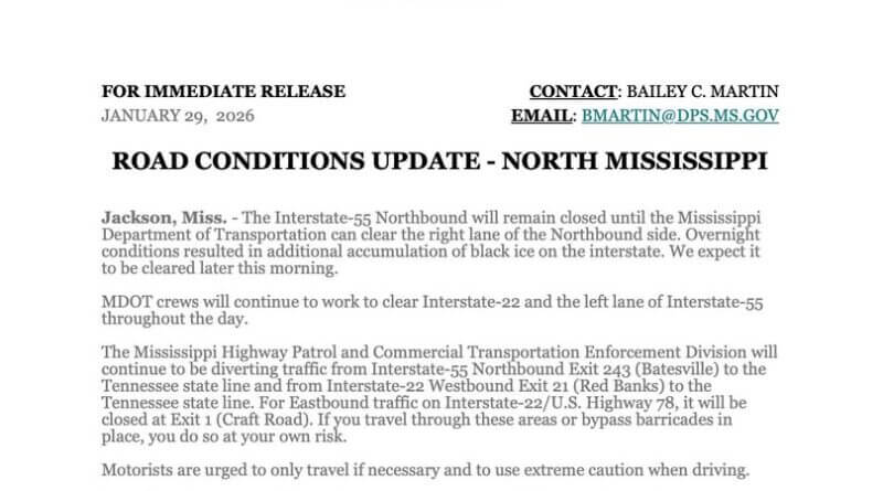 Interstate 55 northbound will remain closed until the Mississippi Department of Transportation can clear the right lane after overnight conditions produced additional accumulation of black ice, MDOT said in a Facebook post. The agency said it expects the lane to be cleared later this morning.