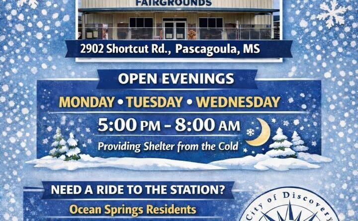 The facility will be open Monday, Tuesday and Wednesday evenings from 5 p.m. to 8 a.m. Ocean Springs residents who need assistance or transportation to the shelter are asked to contact the Ocean Springs Police Department at 228-875-2211. Transportation will be provided to anyone who needs it, the post said.