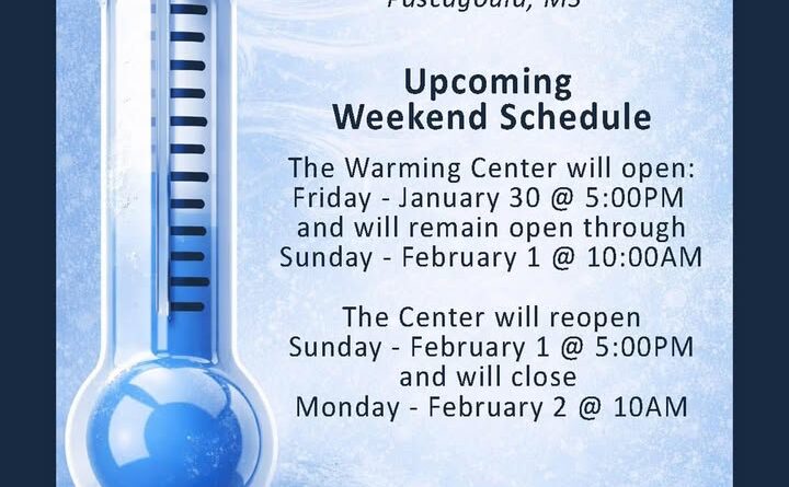Jackson County officials said a warming center will open at the Jackson County Fair Hall in Pascagoula, Mississippi, for the weekend beginning Friday, Jan. 30. The center will open at 5 p.m. Friday and remain open through 10 a.m. Sunday, Feb. 1, then reopen at 5 p.m. Sunday and close at 10 a.m. Monday, Feb. 2.
