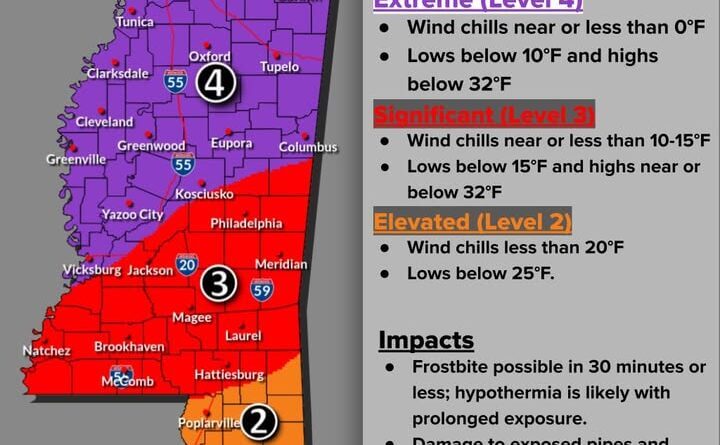 The Mississippi Emergency Management Agency said in a Facebook post that dangerously cold temperatures are expected to persist at least through the morning of Jan. 27, 2026, and urged residents to take precautions if they must go outside.