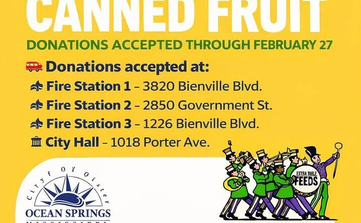 The city is collecting canned fruit now through Feb. 27. Residents may drop off donations at any Ocean Springs fire station or at city hall, city officials said in a Facebook post.