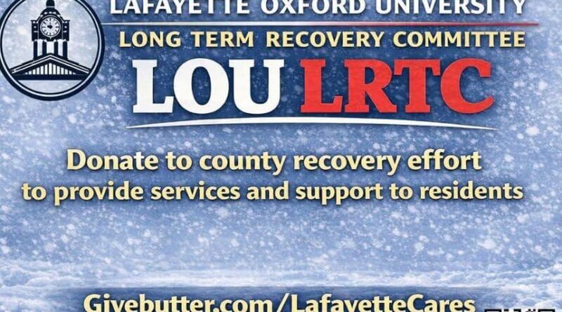 The City of Oxford and Lafayette County said in a Facebook post that they have established an official monetary donation portal to support recovery efforts for local residents. The post described the portal as a safe and secure way for people who want to help, and provided a link to the fundraising page: https://givebutter.com/lafayettecares.