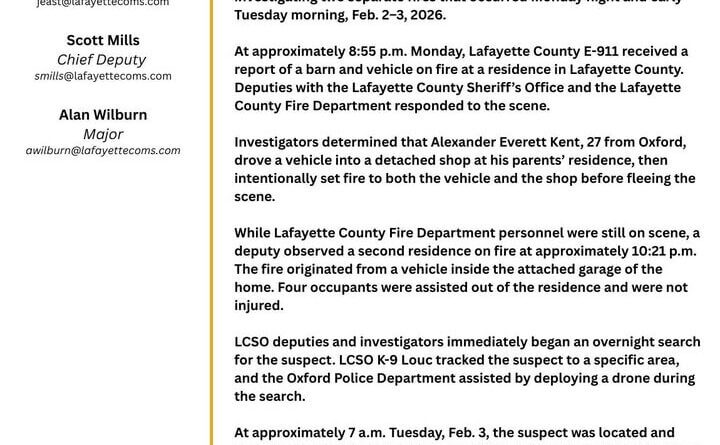 Sheriff East said he was extremely proud of how multiple agencies worked together to apprehend Kent safely and without further harm to property and thanked the Lafayette County Fire Department, Oxford Police Department and Baptist Ambulance Service for their assistance. Kent is being held at the Lafayette County Detention Center awaiting his initial court appearance and has been charged with two counts of arson and one count of felony malicious mischief. Officials said no further information will be released at this time. This is a developing story and will be updated as more details emerge.