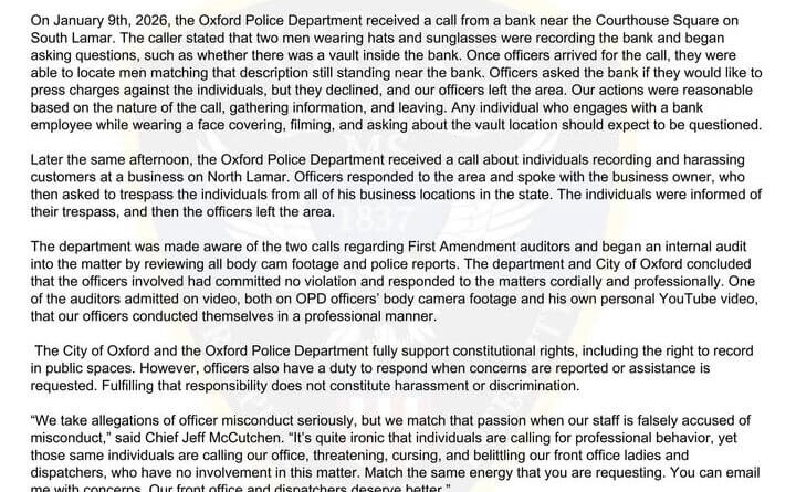 Oxford said it reviewed body-worn camera footage and police reports and concluded officers committed no violation. The city said one of the people recording β often called a First Amendment auditor, a person who records public officials in public spaces to test responses β acknowledged on video that officers acted professionally. “We take allegations of officer misconduct seriously, but we match that passion when our staff is falsely accused of misconduct,” Chief Jeff McCutchen said. “Itβs quite ironic that individuals are calling for professional behavior, yet those same individuals are calling our office, threatening, cursing, and belittling our front office ladies and dispatchers, who have no involvement in this matter. Match the same energy that you are requesting. You can email me with concerns. Our front office and dispatchers deserve better.”