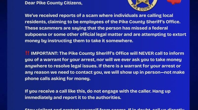 The Pike County Sheriff’s Office posted a notice on its Facebook page warning the public about scam activity, the department’s public relations office said. The brief advisory was shared by the Pike County Sheriff’s Office Public Relations Department and included the hashtag #ServiceBeforeSelf.