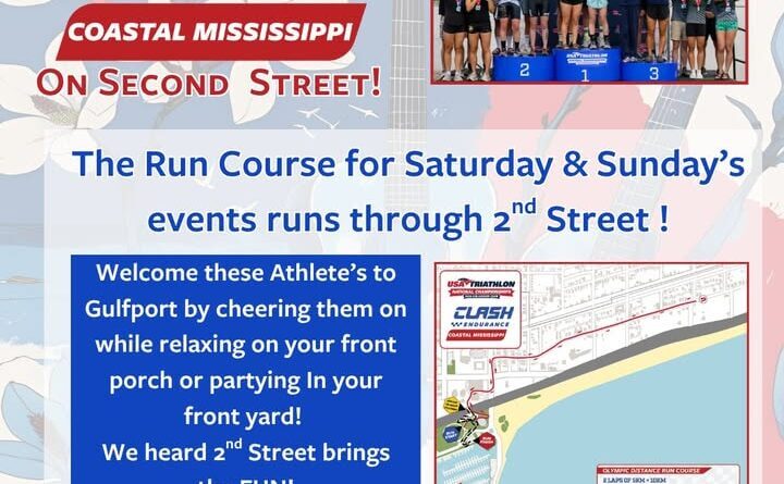 Second Street in Gulfport will close for portions of this weekend as athletes in the CLASH Coastal Mississippi Triathlon run along the route, a Facebook post from Second Street said. Residents are invited to cheer from front porches or yards as competitors pass through.