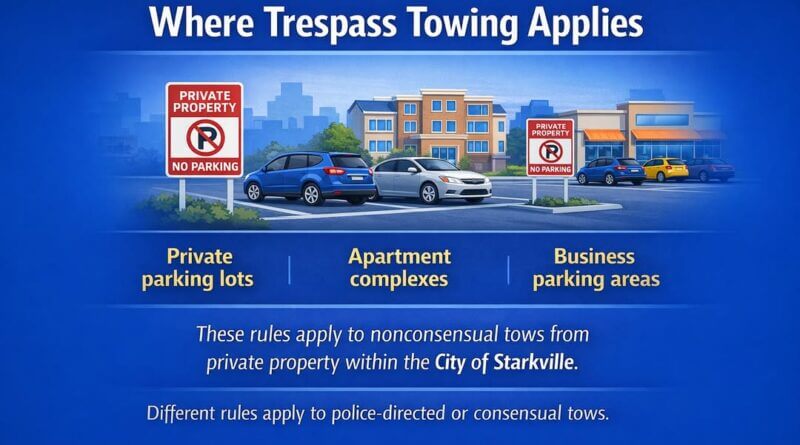 Starkville’s municipal code says trespass towing rules apply to nonconsensual tows from private property within city limits, including private parking lots, apartment complexes and business parking areas, according to ordinance 11.17 on nonconsensual (trespass) towing.