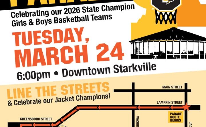 Starkville will host a championship parade Tuesday to celebrate the state champion Yellow Jacket boys and girls basketball teams, SOCSD and the City of Starkville said in a Facebook post. The celebration begins at 6 p.m. in downtown Starkville.