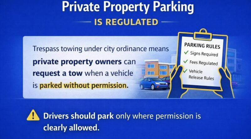 The city said the ordinance aims to clarify property owners’ rights and towing procedures and to reduce disputes between property owners, drivers and towing companies. Drivers can avoid problems by parking only where permission is clearly allowed and by paying attention to posted signs indicating private parking restrictions.
