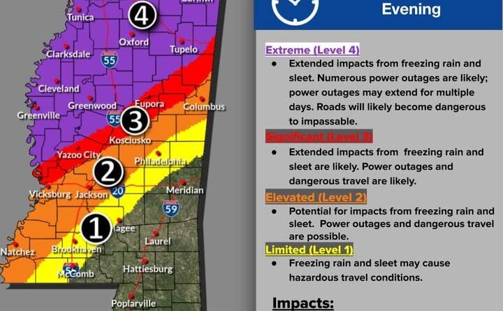 The post also told residents from Natchez to Jackson to Columbus to prepare for very cold weather and the potential for significant impacts from ice, freezing rain or sleet. It directed readers to a risk-level graphic included with the message.
