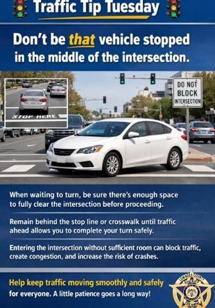 A Facebook post titled “Traffic Tip Tuesday” urged drivers not to stop in the middle of an intersection and to ensure there is enough room to complete a turn before proceeding.