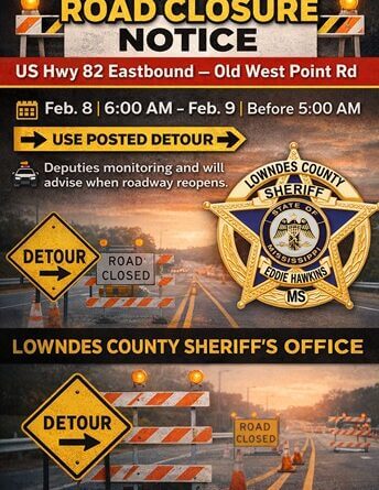 Lowndes County Sheriff’s Office said U.S. 82 Eastbound at Old West Point Road will close beginning Sunday, Feb. 8, 2026, at 6 a.m. The closure will affect the stretch between the Old Slush Creek Bridge and the Tennessee-Tombigbee Waterway Bridge and is expected to end before 5 a.m. Monday, Feb. 9, 2026.