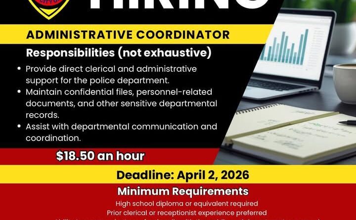 The Vicksburg Police Department is hiring an administrative coordinator, the department said in a Facebook post. The position pays $18.50 an hour and the application deadline is April 2, 2026. Applicants are asked to send a resume to vpdrecruitment@vicksburg.org and to follow a link in the post’s comments for the full job description.