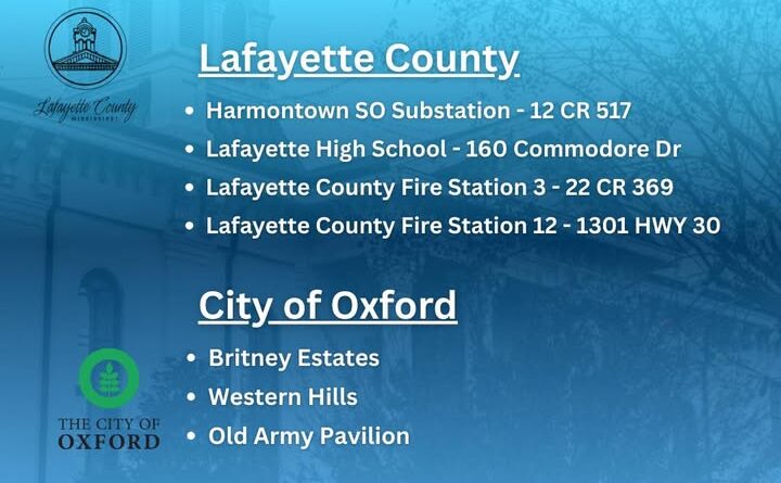 A Facebook post says water and Meals Ready to Eat (MREs) will be distributed starting at 12 p.m. today at multiple sites in Lafayette County and the City of Oxford and will continue until supplies last.