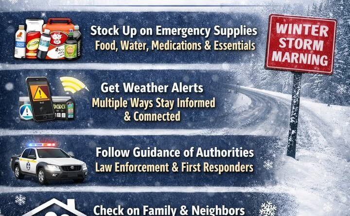 The agency advised individuals and families to assemble emergency supplies, including food, water, medications, batteries, flashlights, first-aid supplies and blankets, and to ensure they have multiple ways to receive weather alerts and emergency notifications.