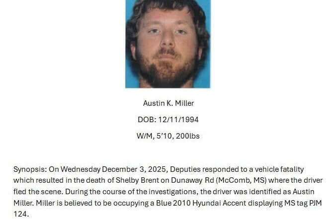 Authorities responded to a vehicle crash on December 3, 2025, on Dunaway Road near McComb, Mississippi, where Shelby Brent was killed after the driver fled the scene. Investigators identified Miller as the driver.