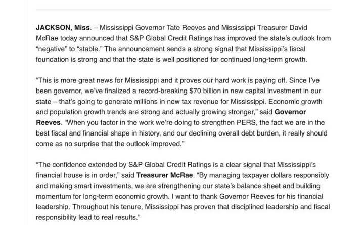 The Mississippi governor said in a Facebook post that the state has finalized $70 billion in new capital investment since he took office, a figure he said will generate “millions” in new tax revenue for Mississippi.