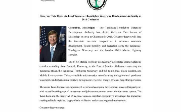 Mississippi Gov. Tate Reeves said in a Facebook post that the state is experiencing historic economic development momentum and that access to the Tennessee-Tombigbee Waterway is a key part of that success.