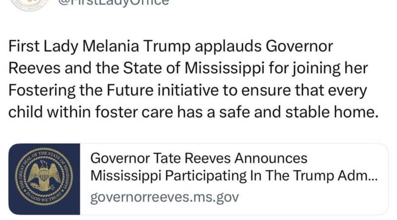 A Facebook post thanked First Lady Melania Trump and said the state looks forward to working with her, saying, “Thank you, First Lady Melania Trump. Our state looks forward to working with you!”