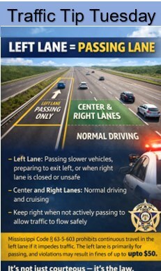 Lowndes County officials remind drivers that the left lane on multi-lane highways is for passing only, not for regular travel. According to Mississippi law, continuous travel in the left lane that impedes traffic is prohibited.
