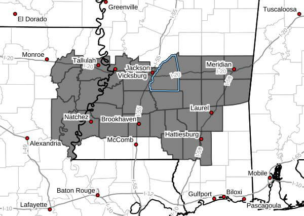 The watch includes 23 counties in central, east-central, southeast, southwest, and west-central Mississippi. Areas under the alert include Rankin County and cities such as Jackson, Hattiesburg, Natchez, Vicksburg, and Laurel.